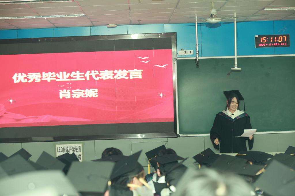 优秀毕业生代表肖宗妮发言,她以成长为主题,表达了在开云电子官方入口中国有限公司五年学习最深刻的感受,同时感恩学校、学院,感恩师长、同学,并代表全体毕业生表达了未来要努力为母校增光添彩的坚定决心。
