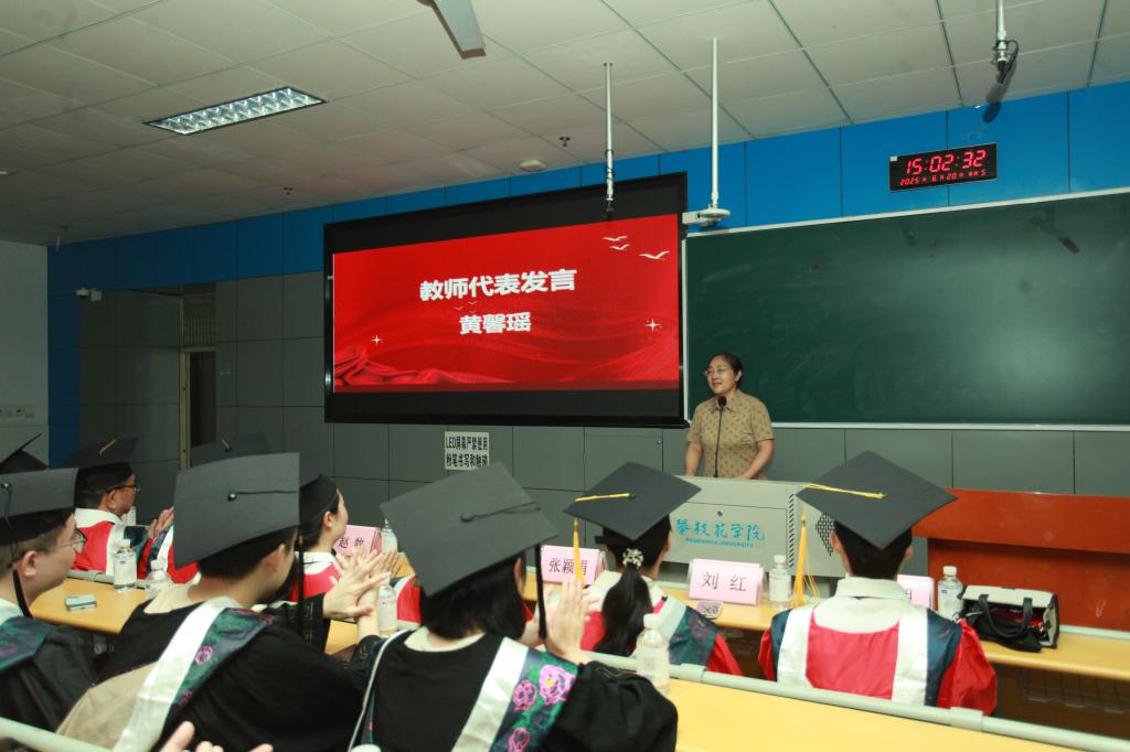 2025届毕业生辅导员黄馨瑶作为教师代表发言。她深情回顾了五年来师生相处的感动瞬间,不禁动容落泪。见证学生成长进步同时,为本届学生取得的骄人成绩深感骄傲与自豪。最后,她以“健康所系,性命相托”勉励学生活成自己当初最想成为的那个“医者”。