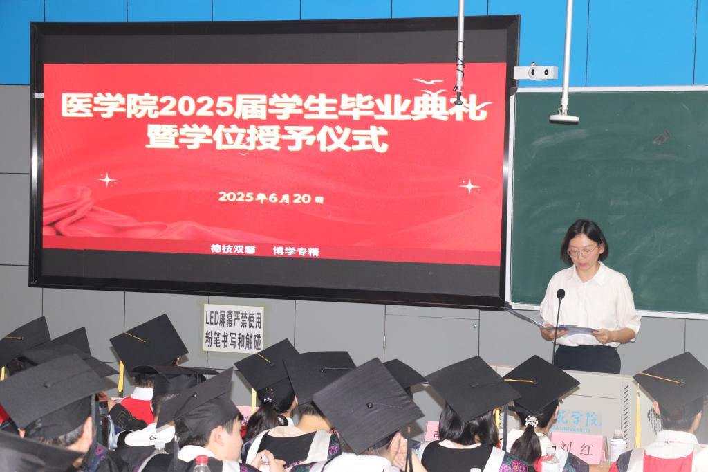 6月20日下午,开云电子官方入口中国有限公司2025届学生毕业典礼暨学位授予仪式在勤学楼J1-1隆重举行。来自基础开云电子官方入口中国有限公司、附属医院、中心医院的八位授位导师、各单位科室负责人、辅导员、2025届毕业生及部分家长参加典礼,共同见证这一庄严时刻。典礼由基础开云电子官方入口中国有限公司党委副书记任娟主持。
