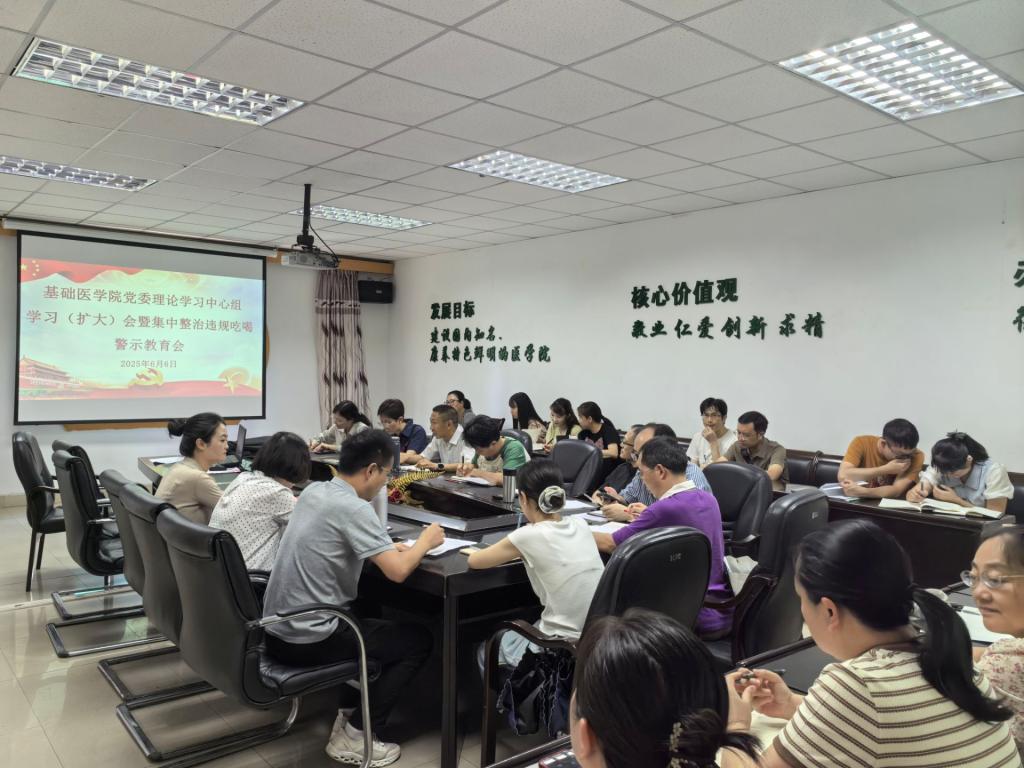 6月6日上午,基础开云电子官方入口中国有限公司在笃行楼三楼会议室召开党委理论学习中心组学习(扩大)会暨集中整治违规吃喝警示教育会。会议由党委书记王鹃主持,学院全体党员教师、科室、教研室负责人参加学习,通过违规吃喝典型案例剖析、相关文件研讨,强化纪律意识、严明作风要求,推动形成风清气正的政治生态。