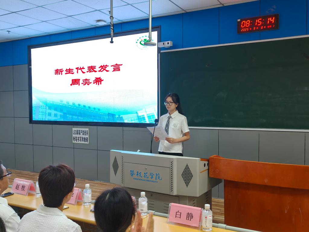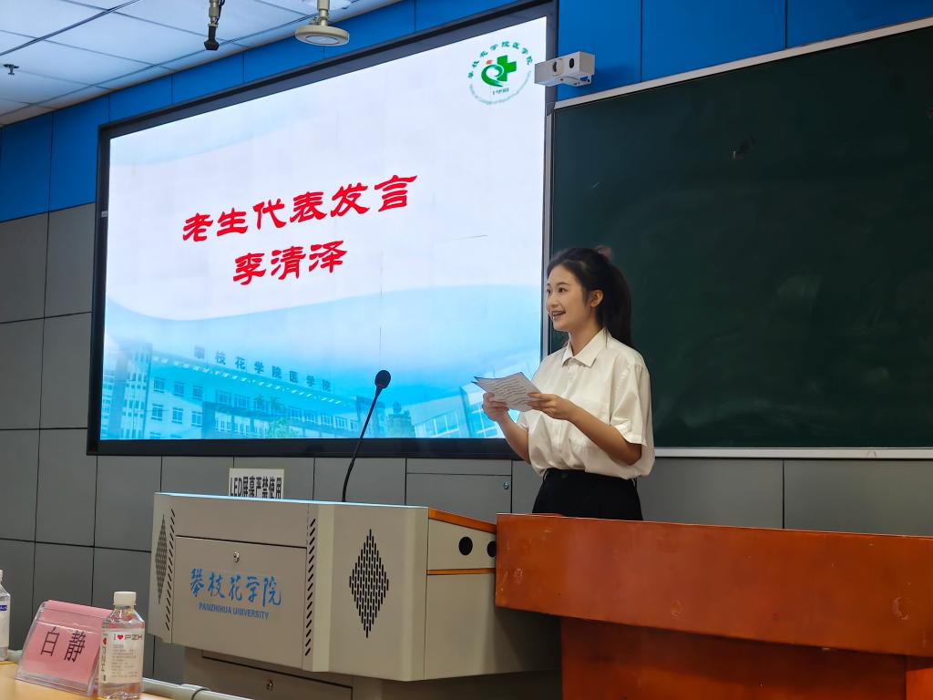 老生代表李清泽结合自身两年的求学经历,从精准规划人生、注重学用结合、全面提升素养三个维度分享成长心得,为学弟学妹们送上了接地气、可操作的“大学指南”,鼓励大家争做“阳光健康美丽”的攀大人。新生代表周奕希向全体新生发出倡议:以“献身医学、守护生命”为信仰,努力成长为“生命的守护者”与“健康的筑梦人”。